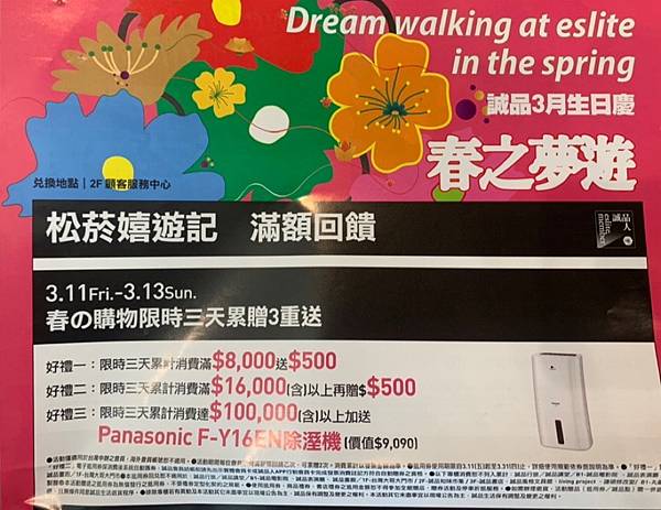 大家午安!松菸誠品3月生日慶優惠活動如下,只有三天喲!歡迎您前來參加。謝謝🙏!力雄茶行在松菸誠品三F。3/11-13消費3000送500消費滿8000元加碼再送500消費滿160000加碼再送500滿10萬元再送國際牌除濕機 - 11月 04 週四 202110:50